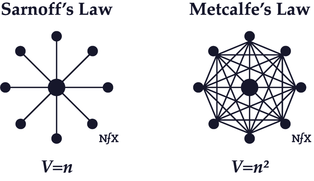 Esse efeito pode ser medido pelas Leis de Metcalfe e de Sarnoff. A primeira afirma que o número de conexões de uma rede é proporcional ao quadrado do número de nós/participantes. Como visível na fórmula abaixo: