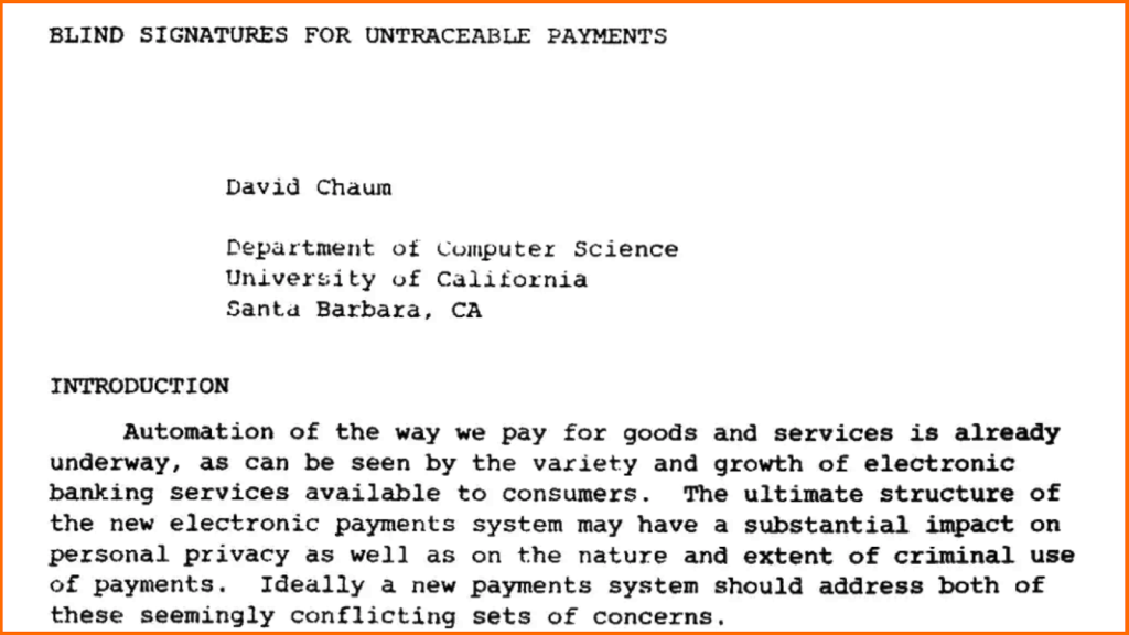 Em 1983, ele escreveu um artigo chamado “Blind Signatures for Untraceable Payments”, no qual apresentava as ideias de como uma transação financeira poderia ser realizada apenas com base em assinatura digital para verificação de autenticidade.