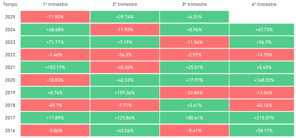 Retornos trimestrais do Bitcoin em dólar. Fonte: Coinglass